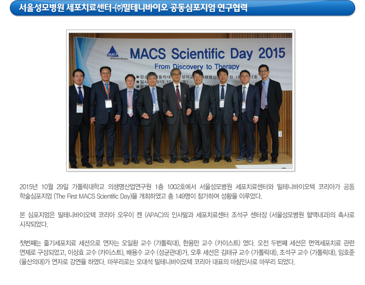 서울성모병원 세포치료센터-㈜밀테니바이오 공동심포지엄 연구협력2015년 10월 29일 가톨릭대학교 의생명산업연구원 1층 1002호에서 서울성모병원 세포치료센터와 밀테니바이오텍 코리아가 공동 학술심포지엄 (The First MACS Scientific Day)을 개최하였고 총 149명이 참가하여 성황을 이루었다. 본 심포지엄은 밀테니바이오텍 코리아 오우이 켄 (APAC)의 인사말과 세포치료센터 조석구 센터장 (서울성모병원 혈액내과)의 축사로 시작되었다. 첫번째는 줄기세포치료 세션으로 연자는 오일환 교수 (가톨릭대), 한용만 교수 (카이스트) 였다. 오전 두번째 세션은 면역세포치료 관련 연제로 구성되었고, 이상효 교수 (카이스트), 배용수 교수 (성균관대)가, 오후 세션은 김태규 교수 (가톨릭대), 조석구 교수 (가톨릭대), 임호준 (울산의대)가 연자로 강연을 하였다. 마무리로는 오대석 밀테니바이오텍 코리아 대표의 마침인사로 마무리 되었다. |